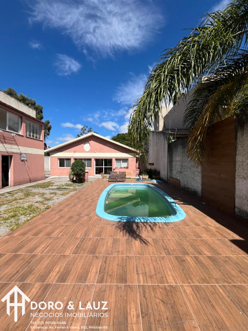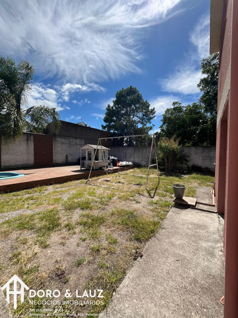 Pátio com piscina, balanços e canil no fundo do terreno.