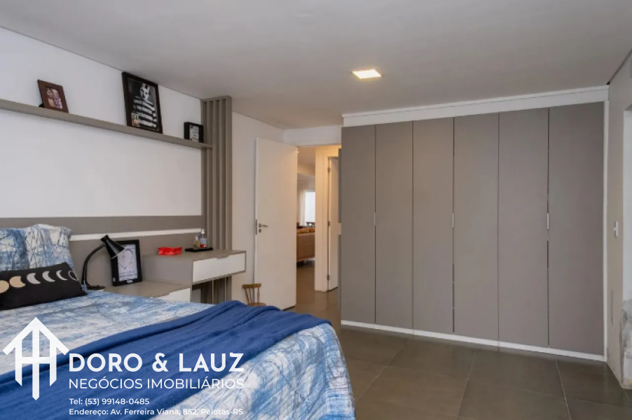 Os armários sob medida na cozinha, dormitórios e banheiros trazem praticidade e elegância, enquanto o piso em porcelanato reforça o acabamento moderno e de alto padrão.